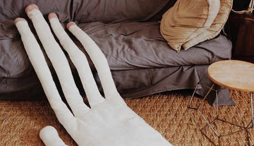 Sopra: Carla Rak, La mano morbida, 2014, Scultura a uncinetto, cashmere, 170 x 55 cm
