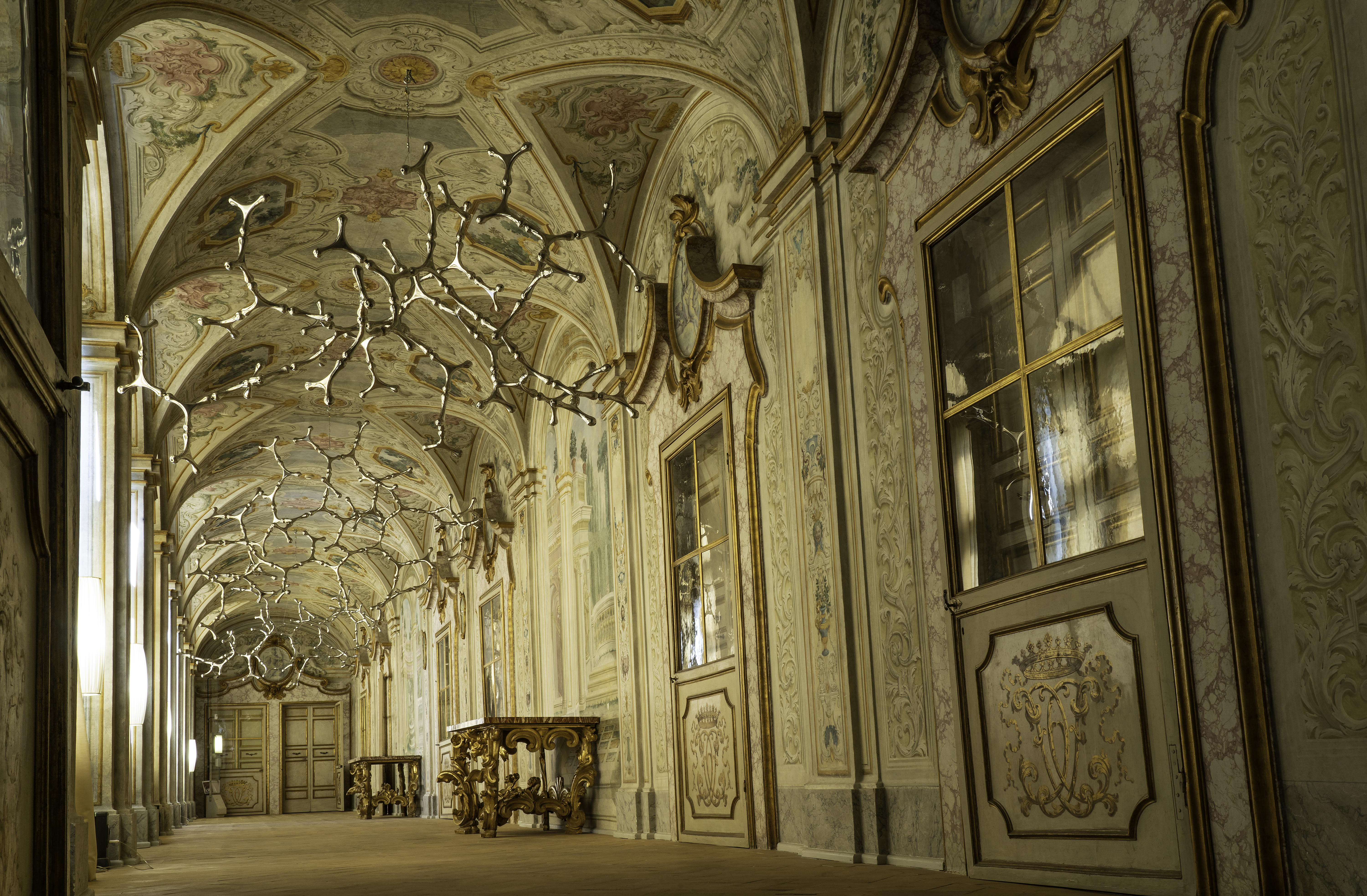 Le sculture in pietra di Bruno Ceccobelli, per esempio, sono state collocate su delle casse per il trasporto lapideo come se la loro forma avesse lasciato sia la dimora eterna della pietra, sia quella relativa dello studio dell’artista. Waterbones, l’air frottage di Cecchini è invece stato installato in modo da creare un continuum coerente con racemi e girali dipinti sui muri o germinati dal mobilio del piano nobile, una sorta di ramificazione osmotica di luce.