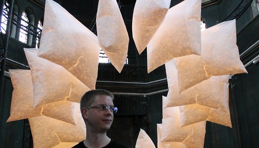 Ma passiamo al duo Novotak (Francia e Giappone), formato dall’illustratrice Noemi Schipfer e l’architetto musicista Takami Nakamoto, entrambi classe 1988, che attraverso la loro Daydream V.2, un’istallazione audiovisiva che suggerisce un susseguirsi sonoro di forme geometriche che quasi ipnotiche destabilizzano i limiti della nostra percezione. Ma ecco Bodymetries di Theresa Schubert (1980, Germania), un lavoro che si ispira alle teorie di Mashall McLuhan: si tratta di un dispositivo interattivo che si attiva scansionando per esempio il vostro braccio, vede apparire su quest’ultimo una cartografia composta da motivi organici che si dispiegano lentamente sulla superficie della pelle. Un’opera artistica biologica che si adatta alla morfologia di ognuno, questo processo si ispira a cellule esistenti conosciute come physaum polycephalum. Da non perdere l’opera interattiva di Stefan Tiefengraber (Austria, 1981) User Generated Server Destruction: basta una connessione internet, recarsi sul sito www.ugsd.net, e azionare a distanza ed in tempo reale sei martelli, che cliccando su un pulsante verde, si azioneranno per colpire il server informatico: il pubblico è così responsabile dell’abbattimento della macchina. Un’opera più poetica è invece quella di Nils Völker (Germania, 1979) Seventeen: si tratta di una creazione lumino-cinetica composta da 17 cuscini bianchi in Tyvek, un materiale sintetico trasparente, questi disposti in alto e a cerchio l’uno accanto all’altro seguono in perfetta sincronia il movimento lento di una respirazione. Se volete saperne di più sul premio, ma anche sulle tante attività del centro, www.lecube.com (livia de leoni)