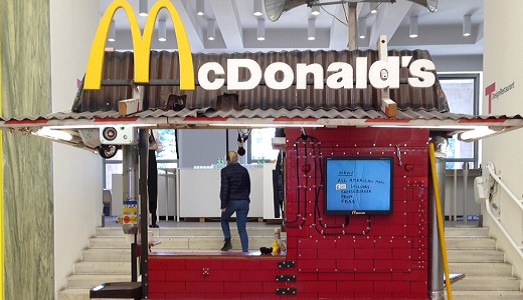 Per cominciare gli appassionati di arredamento e delle forme che ha assunto il design intorno all’economia domestica e al rituale del cibo, troveranno in scena una serie numerosissima sia di ambienti-focolari, tinelli e sale da pranzo dal 1851 alle avanguardie, sia una corollario infinito di vettovaglie di ogni stile: bicchieri, teiere, vasellame vario, vassoi, posate, brocche: sono indici che raccontano le oscillazioni del gusto, come aveva raccontato il grande Gillo Dorfles, stamane in prima linea tra i visitatori della stampa e gli addetti ai lavori in Triennale. Poi, a parte le vetrine, i set da pasto e gli ambienti, ecco l’arte. Una vastissima parte è occupata dalla Pop: Wesselmann e Warhol, con le sue zuppe Campbell e Claes Oldenburg con i suoi famosi-disgustosi gelati sciolti, gli hamburger, la forme del junk-food realizzate sul finire della metà del secolo scorso e che hanno aperto la strada alla pittura di Jeff Koons, e perché no, anche alle installazioni di Tom Sachs, che in Triennale troverete accanto alla caffetteria con il suo Nutsy McDonald’s, 2001 (foto sopra) e la sua carica simbolica come emblema della corruzione del rituale del cibo che si conosceva prima dell’entrata “in vigore” del fast food. Ma non è finita, perché il cibo è visto anche sotto la lente della povertà, specialmente rispetto al periodo del primo Novecento: i nostri giorni sono raccontati invece con una particolare attenzione all’Occidente, ai miti costruiti e decostruiti dell’alimentazione, e del comprare la moderna omologazione del gusto.