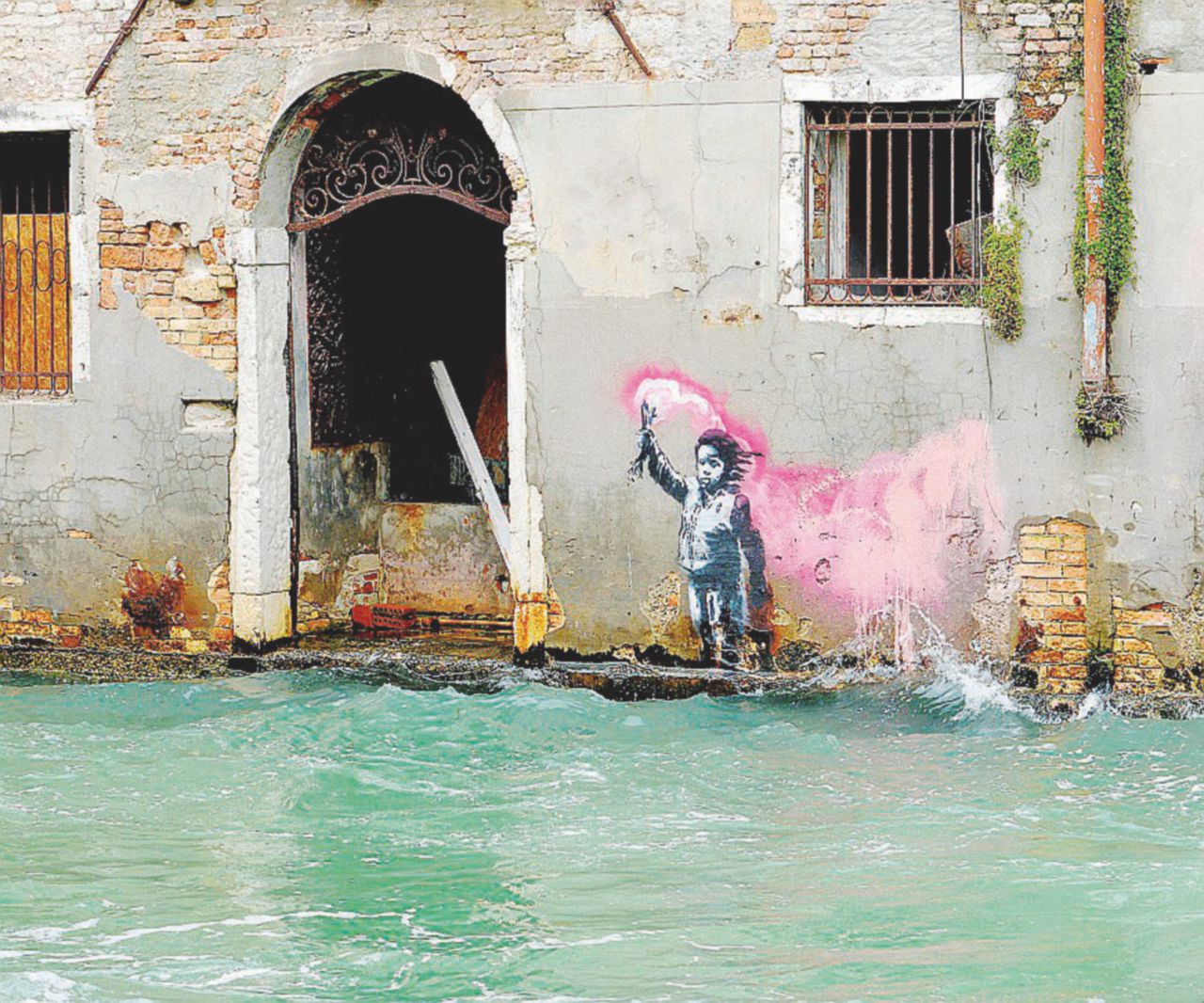 La paternità dell’opera fu rivendicata sulla pagina Instagram ufficiale dello street artist anonimo più famoso al mondo – e considerato ufficialmente l’artista più amato dagli inglesi – in contemporanea con la performance organizzata nel bacino di San Marco, la bancarella senza permesso di esposizione, poi fatta sgomberare dalla polizia. Il murales rappresenta un bambino con un giubbotto salvagente e i piedi immersi nell’acqua, con in una mano un razzo segnaletico. Immediatamente l’agenzia immobiliare Engel&Volkers, proprietaria dello storico palazzetto, aggiunse sul suo sito internet le fotografie dell’opera, insieme all’annuncio di vendita, al modico prezzo di quattro milioni e mezzo di euro.