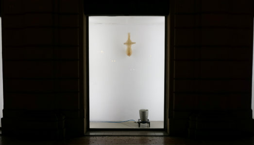 Napsal Siedlecki, quale novello Agatone del Simposio di Platone, ci invita – splendido anfitrione – a un banchetto d’antiche assonanze e mescolanze. Dentro alle vetrine, si scalda sul fuoco il brodo in un pentolone grigio, che in realtà è un’opera del 2016: il Crogiolo, che riprende forma e colore del contenitore usato anticamente in fonderia per sciogliere i metalli puri. E qui fa capolino anche Vulcano. Ma, cambiando il contesto del Crogiolo e il suo uso, ritorniamo al brodo caldo, che emana quel vapore che nel freddo invernale bolognese, la strada, i passanti, quindi esterni nell’oscurità della notte, mi fa venire anche il sabba delle streghe, sarà per i richiami, sempre bolognesi, che mi riportano alle lezioni universitarie di Carlo Ginzburg. E poi sopra, ancora le interiora di animale gonfiate fino a diventare un contenitore di liquidi, rinforzano il richiamo alla selva, alla caccia, alle tradizioni contadine e ai gesti e costumi millenari.