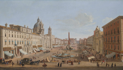 In alto: Gaspar Van Wittel detto Vanvitelli, Roma, Piazza Navona con Palazzo Pamphilj e le chiese di Sant’Agnese in Agone e San Giacomo degli Spagnoli