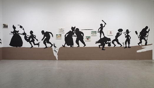 Sopra: Kara Walker, The Nigger Huck Finn Pursues Happiness Beyond the Narrow Constraints of Your Overdetermined Thesis on Freedom Drawn and Quartered by Mister Kara Walkerberry, with Condolences to the Authors, 2010. Carta tagliata e vernice sul muro; gouache e inchiostro su carta, (29.2 x 38.1 cm). The Barbara Lee Collection of Art by Women. Courtesy l’artista e Sikkema Jenkins & Co. Veduta dell’installazione, First Light: A Decade of Collecting at the ICA , The Institute of Contemporary Art/Boston, 2016-17. Fotografia realizzata da Charles Mayer Photography. © 2016 Kara Walker