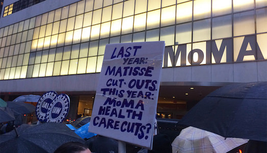 Le negoziazioni sono iniziate nel mese di maggio, ma la svolta è arrivata il 2 giugno quando una protesta fuori dall’annuale gala di raccolta fondi “Party in the Garden”, ha portato all’attenzione pubblica il contenzioso contrattuale in atto tra il museo e l’unione dei lavoratori. Decine di persone hanno manifestato all’entrata della festa impugnando cartelli con su scritto “Arte moderna, salari antichi” o “MoMA, non tagliare la nostra assistenza sanitaria.”