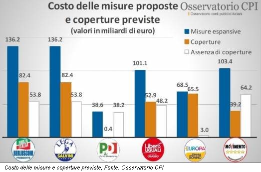 Il 20 dicembre 2017, vale a dire a più di due mesi prima del voto, l’Osservatorio Conti Pubblici Italiani ha iniziato a rendere note le traduzioni dei programmi politici in misure economiche, evidenziando l’andamento sulla spesa pubblica e sulle misure di copertura previste dai principali programmi politici. Il dato è allarmante: la maggior parte dei programmi politici prevede un incremento importante della spesa pubblica, soltanto in parte coperto da misure di rientro del debito.