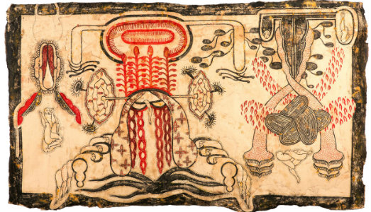Ad accogliere all’ingresso su Upper Street, Condizione di fondo, una tra le maestose carte della sua produzione che raggiunge e supera i due metri, appesa nuda come da consuetudine alla parete, accanto al grande formato incorniciato di Moxhay, intitolato Window, e alle sculture firmate da Glendinning. Sembrano incarnazioni delle anonime figure che popolano i mondi sommersi circoscritti da Pellegrini, la cui unicità formale è qui opportunamente rappresentata.