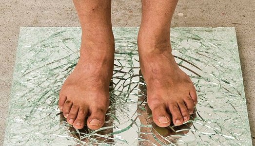 Passi, titolo che ricorda anche una sua celebre serie, rappresenta un gesto semplice e allo stesso tempo inquietante: sfidare a piedi nudi una superficie fredda e (forse) tagliente come quella del vetro scheggiato.