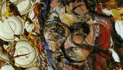 Foto sopra: Julian Schnabel, A Sandro Chia, 1981/1982, tecnica mista su compensato e piatti, 62 x 62 x 5 cm. (particolare)