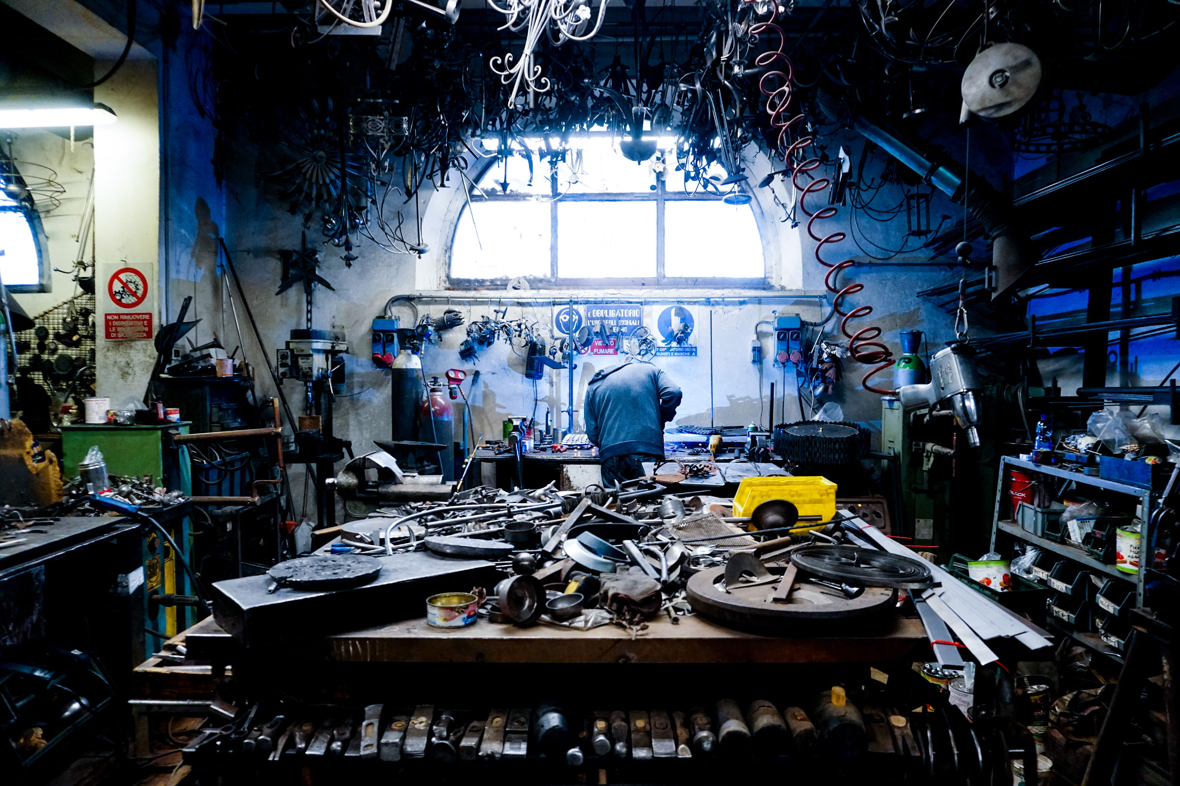 In alto: Panoramica della bottega Euro Lamp Art. Ph. Elena Janniello
