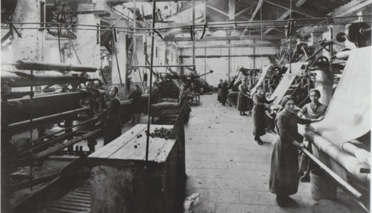 In alto: Donne al lavoro nel reparto di rifinizione della fabbrica Forti a La Briglia (1916)