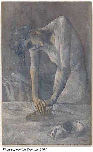 All’inizio del ‘900 non era facile vivere come pittore, specialmente in una realtà come Parigi. Lo sapeva benissimo Emile Zola, che qualche anno prima aveva dedicato il romanzo “L’opera” agli amici Impressionisti, uno su tutti Paul Cézanne, che si risentì parecchio del “paragone” con la vita del pittore Claude. E lo sapeva bene anche Picasso, che a corto di soldi spesso utilizzava tele già dipinte, sacrificando così vecchi quadri, come fece per tutta la vita. Non esce da questa “abitudine” di gioventù nemmeno il dipinto Ironing Woman, che raffigura una donna “in blu” china su un ferro da stiro, che schiaccia con tutto il suo peso la stoffa sul piano.