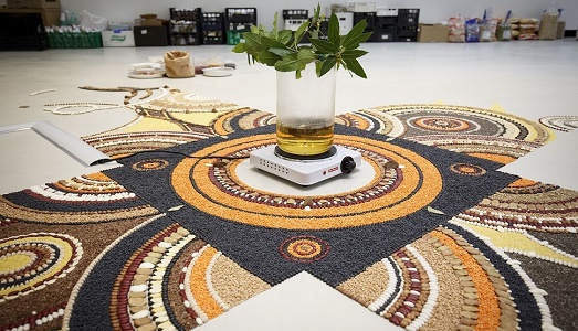 Sopra: Bruna Esposito, E così sia…,2000, posa in opera e installazione con disfacimento finale: legumi, cereali, alloro, fornello elettrico, recipiente in pirex, acqua. foto Musacchio ianniello, courtesy Fondazione MAXXI