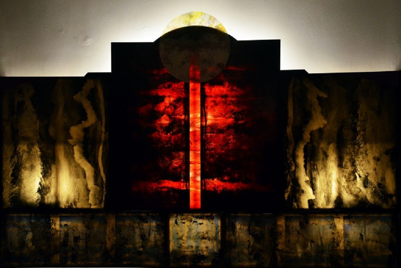 La retroilluminazione delle sue opere su vetro ne valorizza l’aura misteriosa e simbolica, in cui la pratica d’innesto quasi alchemica tra luce e materia produce aloni di energia che si irradiano nell’ambiente circostante. In questo “eremo”, il fruitore naufraga o approda in una dimensione sacrale, fuori dallo spazio e dal tempo.