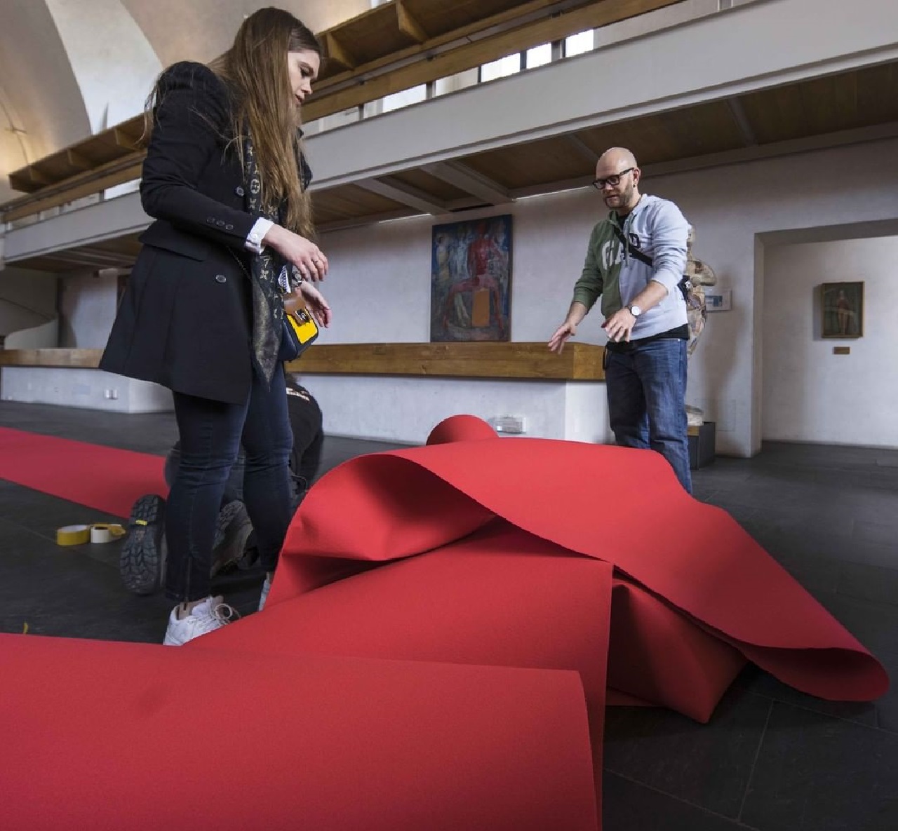 Scorre per i corridoi, si accartoccia negli angoli, curva dopo lo stipite di una finestra e prosegue all’altro capo della grande sala. È il lungo tappeto rosso che corre nel grande spazio espositivo centrale del Museo Marino Marini. Senza apparente inizio né fine, l’opera di Ivan Plusch è il filo rosso che congiunge e tocca alcune delle sculture esposte e ci accompagna dentro “Accents, Accenti, Акценты”, collettiva aperta fino al primo luglio al Muso Marino Marini di Firenze.