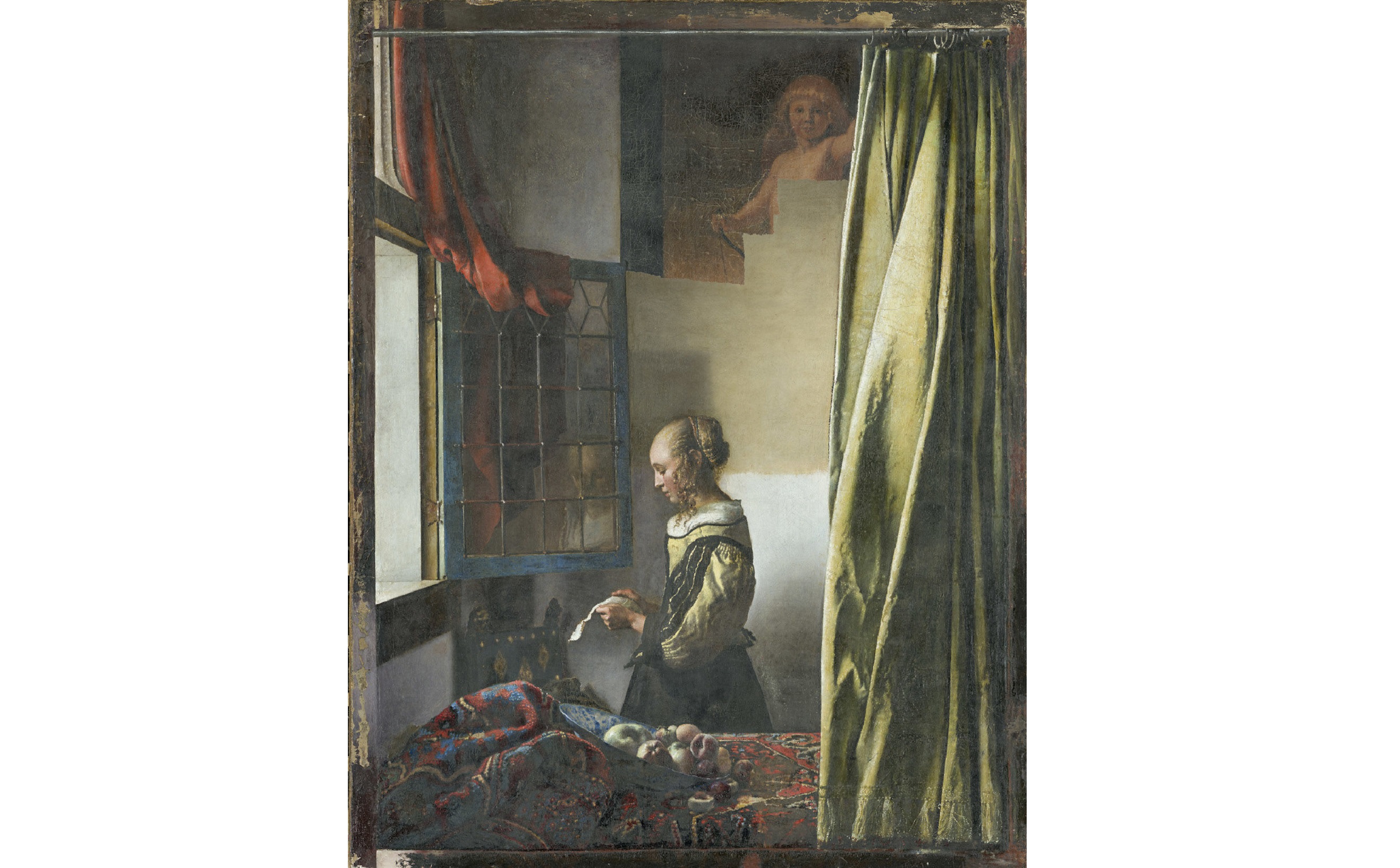 La Donna che legge una lettera davanti alla finestra non era da sola. A farle compagnia, dal 1657 circa, cioè da quando Jan Vermeer dipinse la tela, conservata dal 1955 alla Gemäldegalerie di Dresda, c’è anche un Cupido paffutello e capelluto. Solo che nessuno – almeno tra i viventi – l’aveva visto, prima del restauro che ha nuovamente portato alla luce la figura.