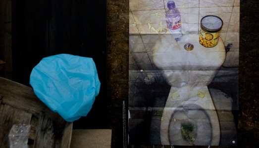 “Non che sia davvero accogliente questo spazio, anzi: è stipato di oggetti che limitano gli spostamenti – spiega il curatore Giorgio Verzotti – due panche e un grande tavolo apparecchiato con stoviglie sporche “à la Spoerri”, pareti quasi completamente ricoperte di fotografie e ritagli di giornale, frasi scritte a mano in francese, una chitarra, le luminarie di Natale appese alle pareti, una vasca da bagno, tante grandi foglie di palma secche. Insomma una specie di Merzbau, fatto di legno, lamiera ondulata, cartone”.