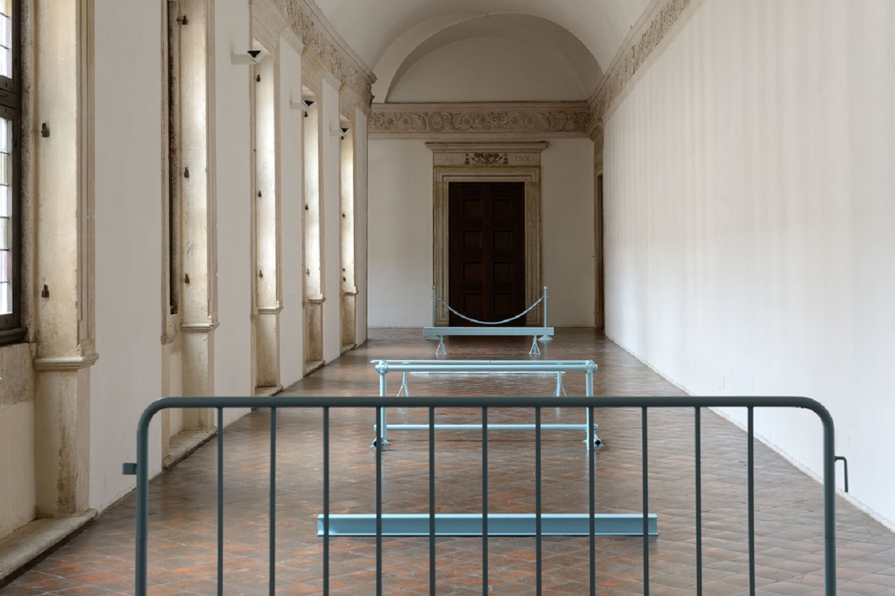 Con il suo azzurro carta da zucchero, e che sciccheria!, Ostacoli (2019) di Giovanni Termini, unica opera realizzata dopo un sopralluogo dell’artista (chi conosce Termini sa benissimo che il suo modus operandi è quello di fare spazio), sembra fatta di materia diafana e ghiacciata, sembra realizzata con segni di cielo, sembra quasi la materializzazione della invisibile armonia teorizzata da Giordano Bruno: è a tutti gli effetti una leggerissima barriera (sette elementi) che “impedisce” allo spettatore il passaggio per trasformare l’aria che respira in scultura, in parte di un tutto.
