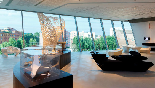In alto: L’Italia di Zaha Hadid, Allestimento della mostra al MAXXI, foto Musacchio Ianniello, courtesy Fondazione MAXXI