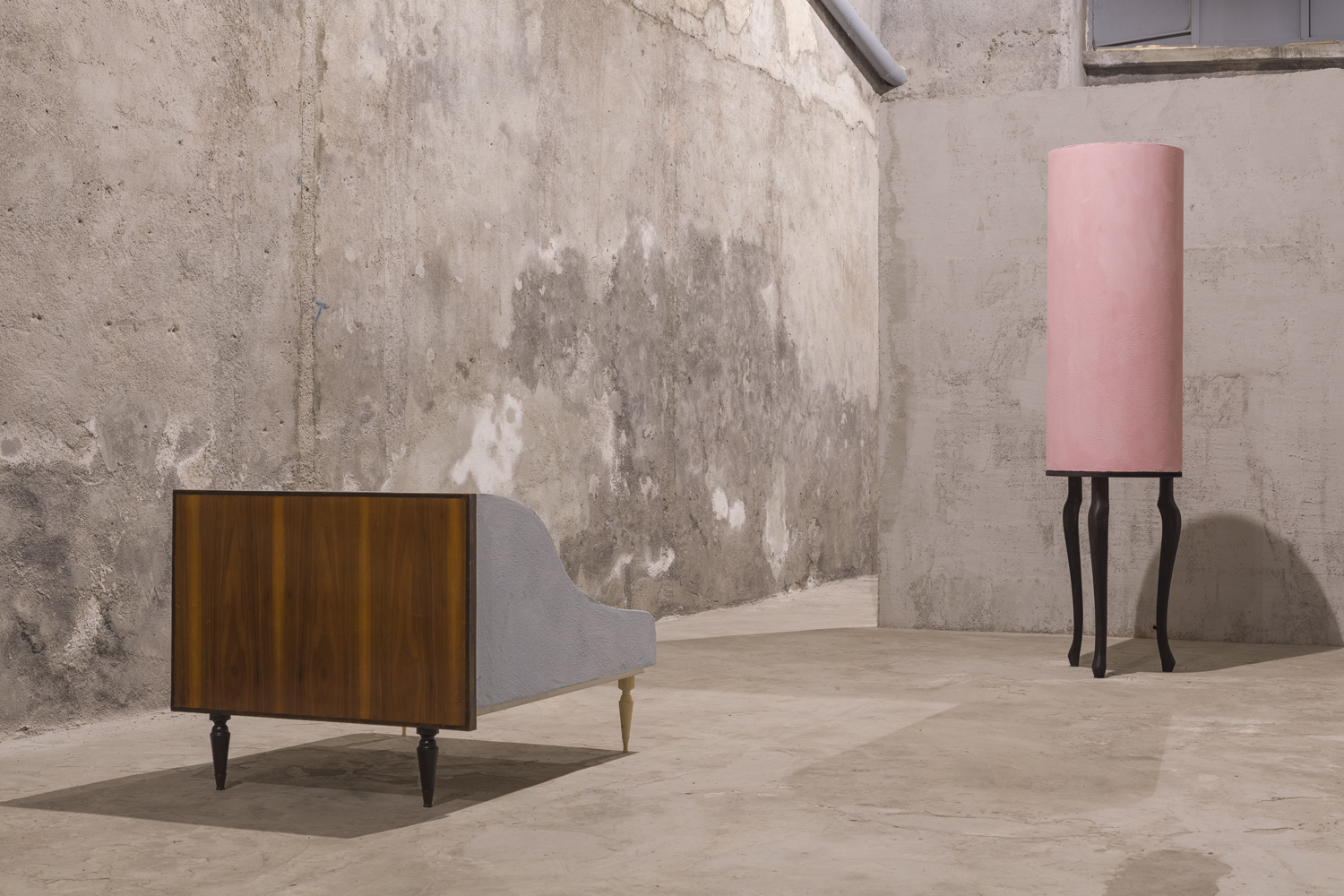 Tre nuove grandi sculture dalle forme levigate, geometriche e dai colori pastello si ergono nello spazio espositivo e sembrano interrogarsi non solo sull’eredità modernista ma anche sulla possibilità di trasformare l’oggetto quotidiano in oggetto minimalista. Opere a prima vista minimaliste svelano il bisogno di riformulare e annullare la distanza tra le categorie estetiche con cui giudichiamo gli oggetti giornalieri in quanto belli o kitsch.