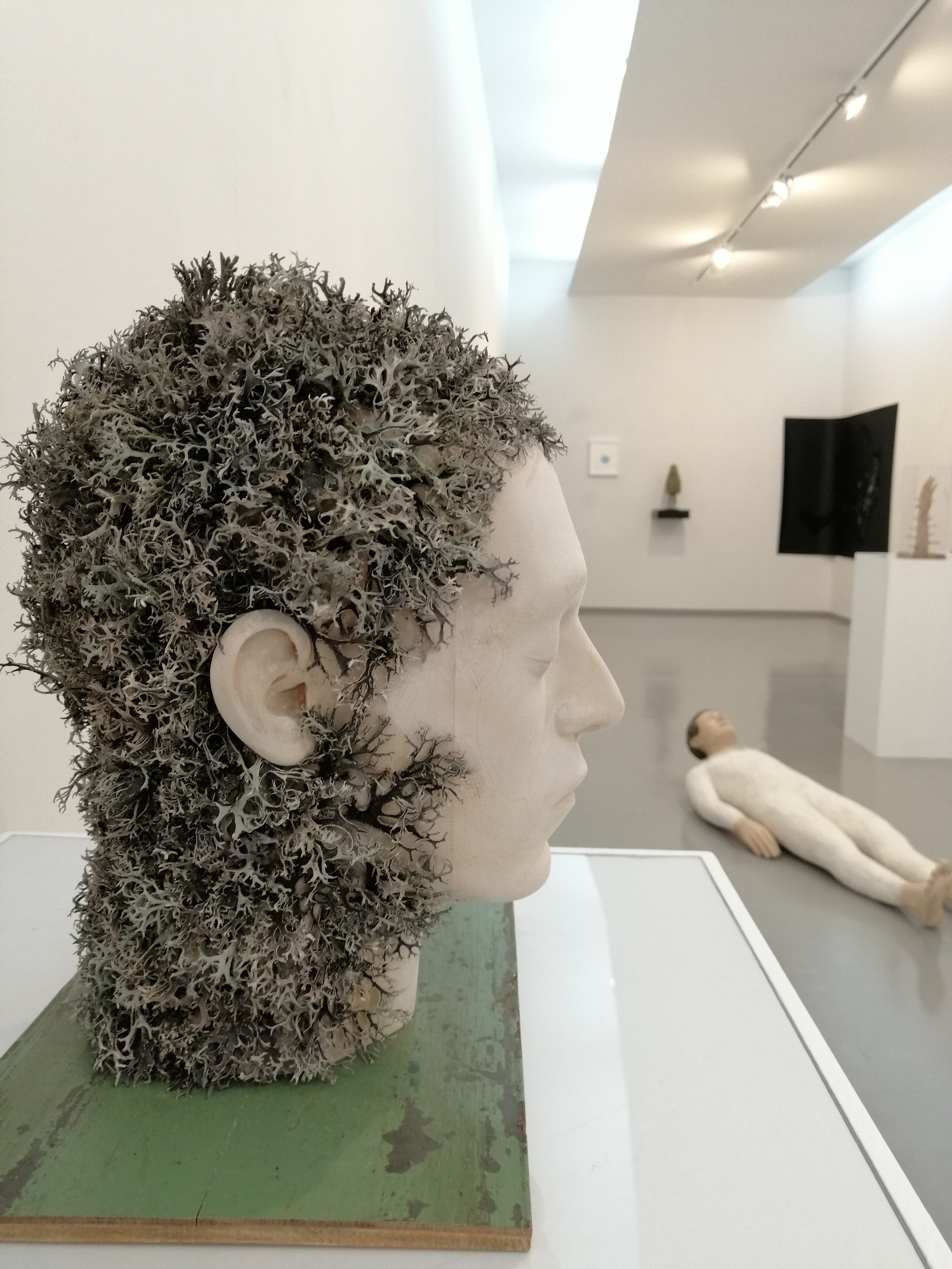 Logan, attraverso il disegno, propone sia “nuove specie”, a metà tra l’umano e il vegetale, che si evolvono ed emergono da una dimensione più profonda del nero, sia una serie di erbari di queste specie realizzati in maniera lenticolare con pastelli blu che evidenziano delicatamente questo rapporto di reciproca mutazione. Senoner, invece, utilizza l’antica tecnica della scultura in legno, tipica della sua terra di origine, la Val Gardena, ma la attualizza aggiungendo al materiale principale elementi di derivazione vegetale e animale, realizzando figure statiche che riescono a trasmettere nel loro silenzio lo smarrimento dell’umanità. Allo stesso tempo questa scultura personale e profonda è in grado di indagare sulla memoria biologica e neurologica in linea con gli studi del biologo e neurologo Richard Semon