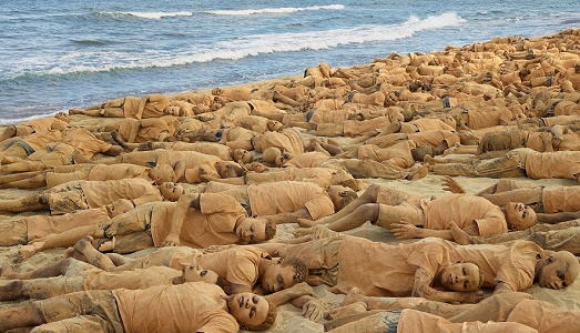Che cosa si vedrà? Per esempio lo scatto Memory Day (sopra), che mostra una serie di corpi sdraiati sulla spiaggia del Lido Verde, color sabbia: «Per qualcuno possono sembrare cadaveri; invece il mio intento è di descrivere il loro arrivo e l’inizio del loro futuro», spiega l’artista, che è a sua volta ritratto nel pezzo The Hope: Bolin ha scelto di fondersi con la prima barca che nel 2013 ha trasportato dei migranti dall’Africa sulle coste catanesi. Tra essi, sei bambini egiziani che, stremati dal viaggio su quel peschereccio, sono annegati tragicamente cercando di guadagnare la riva, a pochi metri dalla spiaggia dello stesso Lido. Una progetto dal tono tragico, e forse un po’ surreale come tutte le azioni dell’artista cinese: connubio perfetto per un tema difficile, come una traversata dalle grandi speranze.