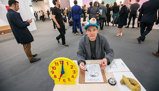 E anche fino a qui, a parte il tono un po’ “strict” della faccenda, passi. Ben più strana è la proposta del giapponese Ken Kagami della galleria Misako & Rosen di Tokyo, proposta nella sezione Focus come anche Arcadia Missa. Kagami saluta educatamente il visitatore (nelle foto alcuni momenti della performance), come fanno sempre i giapponesi, chiede il nome, lo guarda bene in faccia e poi disegna un’interpretazione dei suoi genitali. Con le donne si concentra sulle ghiandole mammarie. Una specie di screening, insomma, ma non richiesto. E l’intimità è messa a nudo.