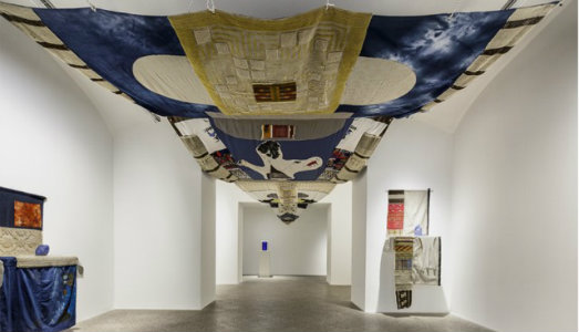 In alto: Ettore Favini, Genova, 2016, Arazzo (Pink Sardinian), 2016, installation view at MAN Museum, Nuoro