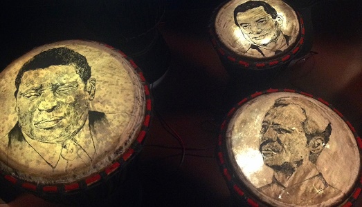 Il risultato? Che non solo Spada si è portato a casa i piccoli, ma ha raccolto anche i grandi: dietro una scrivania, in una stanza dell’ufficio, è installato per esempio uno splendido “arazzo” parietale di sacchi di juta firmato da Ibrahim Mahama, mentre di Maria Morganti la splendida serie fotografica (279 pezzi) Acqua (home page), realizzata a Venezia nel 2013, inquadrando ogni giorno il canale di fronte allo studio dell’artista e scattando una fotografia che ne documenta variabili cromatiche e temporali, in relazione con le sue Sedimentazioni; e poi Paul Graham, l’africano Dimitri Fagbohoun che in Les Patriotes (sopra) dipinge ad inchiostro su una serie di djembes i volti dei Presidenti africani del passato, tatuando così la storia dei Paesi che hanno governato, e raccontando del proprio “nomadismo”.