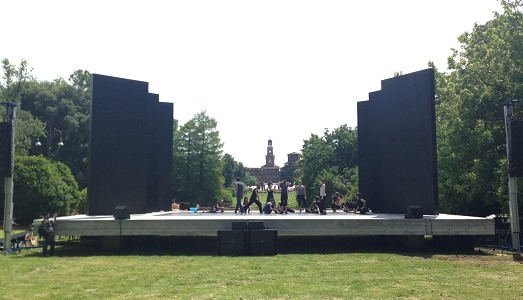 Progetto nel 1973 in occasione della XV Triennale, nel 1989 era stato smantellato dopo essere stato vandalizzato, il teatro sospeso ed essenziale, con sei quinte laterali bianche lato Castello Sforzesco e nere lato Arco della Pace, si colloca di nuovo lungo quest’asse panoramico di bellezza. E da stasera, gratuitamente, riprenderà la sua funzione grazie ad una serie di spettacoli realizzati dalla Civica Scuola di Musica Claudio Abbado e dalla Civica Scuola di Teatro Paolo Grassi (per la Danza). La realizzazione della “nuova” opera, messa in atto grazie all’azione di NCTM Studio Legale, stamattina però ha avuto un nuovo “attacco” durante la presentazione: un piccolo gruppo di manifestanti si è parato contro gli attori della conferenza stampa ribadendo che questa operazione non ha rispettato milanesi e verde cittadino. Il non rispetto di una città, per quanto ci riguarda, forse consiste più nella sua incuria e non nel riallestimento di un progetto di un’artista indiscutibilmente grande. La prossima scommessa di Milano sarà proprio quella di mantenere vivo questo teatro-opera.