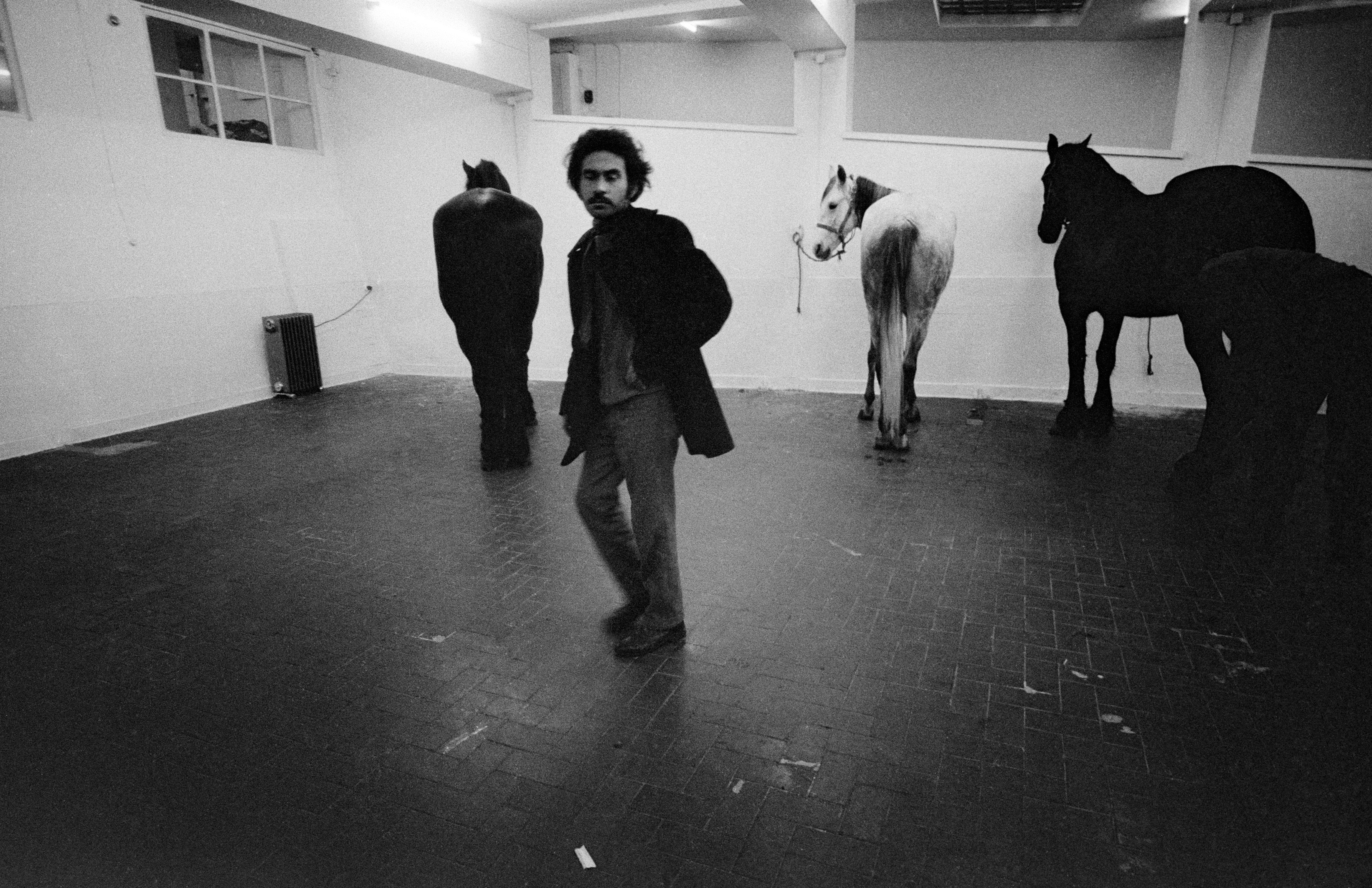 In alto: Ritratto di Jannis Kounellis con cavalli, Roma 1969 Galleria L’Attico. Foto Claudio Abate