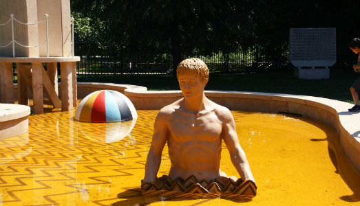 I Bagni Misteriosi, o Fontana metafisica, furono progettati da Giorgio de Chirico e realizzati dall’ingegnere Giulio Macchi nel 1973, in occasione della mostra “Contatto Arte/Città”, presentata durante la XV edizione della Triennale di Milano. Ideato per essere collocato nel Parco Sempione, il complesso scultoreo prende il nome da un famoso ciclo di dipinti degli anni trenta dello stesso de Chirico e comprende una grande piscina dove sono collocate le statue di due nuotatori, un cigno, una palla, una cabina e un trampolino. Tali sculture, inizialmente pensate per una breve esposizione nel parco, furono realizzate in pietra di Vicenza, materiale estremamente fragile e deteriorabile. Da qui la necessità di preservarne la conservazione e, nel 1997, le sculture furono rimosse dal parco e messe in sicurezza in attesa dell’intervento di restauro, iniziato nel 2008. I due nuotatori originali e il pesce sono stati sostituiti nella vasca da e gli originali sono esposti al Museo del Novecento, a testimonianza del legame profondo e duraturo dell’artista con la città di Milano.