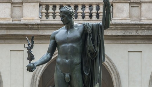 C’è voluto un anno, ma alla fine rieccolo lì, Napoleone, in tutta la sua statuaria bellezza. Stiamo parlando, ovviamente del bronzo del Bonaparte “in veste di Marte Pacificatore” di Antonio Canova e del relativo basamento, collocati come noto al centro del Cortile d’Onore del Palazzo di Brera, a Milano, il cui restauro è stato presentato stamattina in un’affollata conferenza stampa. Del bronzo, sì, perché come è noto il grande condottiero – che fondò l’attuale Pinacoteca, allora Real Galleria, nel 1809 – alto e statuario non era, e il merito di questo suo aspetto apollineo va unicamente al grande maestro veneto, che avrebbe potuto rendere bello e prestante anche il gobbo di Notre Dame e Rigoletto. Battute a parte, l’intervento sulla statua era necessario perché la superficie era stata danneggiata non solo dalle solite “alterazioni chimico-fisiche causate da fattori meteorologici e dall’inquinamento” (leggi smog e piogge acide), ma anche da distacchi e cadute di frammenti, soprattutto del collarino in marmo.