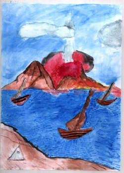 I temi preferiti da questi giovani artisti sono stati: il Vesuvio in eruzione, il golfo di Napoli e l’Isola Ferdinandea, ma anche i Templi di Paestum, il venditore dio cappelli, l’acquaiuolo e le feste di piazza. Questi i soggetti dei disegni che testimoniano come l’educazione e l’osservazione del territorio, in questo caso specifico attraverso un’esposizione di opere d’arte, possa essere la base per l’acquisizione del senso di appartenenza al territorio e determinare così l’identità di un luogo. L’esposizione è accompagnata dai pensieri dei bambini che si rincorrono in un lungo nastro che si snoda sul pavimento per l’intero percorso e ci raccontano: “Ho immaginato che tanto tempo fa io ero un pittore, e tutti mi chiamavano per dipingergli qualcosa, ma soprattutto dipingevo per me”; “mi piace molto l’aspetto innevato del Vesuvio, perché mi dà un senso di calma, come di un bambino addormentato nella sua culla”; “una tela, un pittore, un pennello: queste le tre cose per fare un quadro. Ma per fare una gouache ci vuole qualcosa di più leggero, leggero come la piuma di un gabbiano da usare per disegnare la propria emozione”.(manuela esposito)