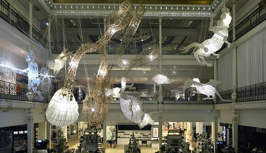 Fino al 20 febbraio al Bon Marché Rive Gauche di Parigi, uno degli store più trendy della Capitale francese (del gruppo LVMH) espone opere assolutamente da non perdere. Titolo della mostra? Er Xi, vale a dire area di gioco. Installazioni che riecheggiano un universo da sogno, si ispirano a Shan Hai Jing, un antico testo dei monti e dei mari che raccoglie racconti epici e leggende popolari dell’antica Cina, narrati ai bambini da oltre 2mila anni. «Questa esposizione si rivolge al bambino che è in noi», e a dirlo è Ai Weiwei, artista che ha creato una trentina di personaggi, tra cui imponenti dragoni realizzati con magnifiche piume. Per dare vita a queste creature mitologiche si è utilizzata la tecnica ancestrale della creazione di aquiloni, vale a dire utilizzando la duttilità del bambù e la leggerezza della carta di seta. Ai Weiwei si è rivolto al più grande artigiano cinese nel campo, Wong Yong Xun, con la volontà inoltre di oltrepassare i limiti di questa fabbricazione artigianale. Colore privilegiato della mostra è senza ombra di dubbio il bianco. Per Ai Weiwei esporre al Bon Marché significa usare un nuovo mezzo di comunicazione, il grande magazzino, per andare incontro ad un pubblico diverso, largo tanto quanto quello del museo. (Livia De Leoni)