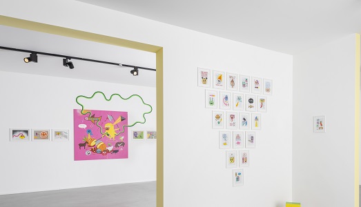LP «Dopo l’esperienza in Spagna, volevamo fare un progetto assieme anche in Italia e l’occasione è giunta facendo conoscere il lavoro di Albert alla Martina’s Gallery. Nel corso degli anni entrambi siamo cresciuti, la nostra ricerca artistica è maturata, io sono diventata più rigorosa e più precisa, lasciando un po’ da parte quella vena grafica ‘sporca e punk’ che contraddistingueva i miei lavori su carta di qualche anno fa. Ora ho la necessità di confrontarmi con lavori più complessi che richiedono molto tempo per essere realizzati. Dal canto suo, Albert sta seguendo una linea quasi più astratta rispetto al passato, lavorando anche con la scultura e l’installazione. E il punto d’incontro lo abbiamo trovato con questa mostra, dove abbiamo voluto sperimentare lavorando assieme a quattro mani su tela e carta, una vera e propria ‘fusion’ visionaria, in cui viaggiano e si uniscono i nostri personaggi, trasformandosi e mutando all’interno di un ‘Wormhole’ supercolor». (Rossella Farinotti)