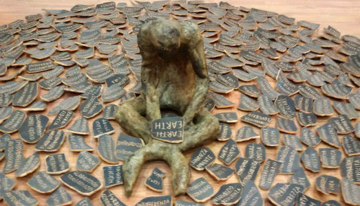 Due parole sono scritte su altrettanti frammenti di ceramica. Una si deve esiliare, il concetto deve essere dimenticato, l’altra va accolta, fatta propria, messa in pratica. Prendendo spunto dall’istituzione giuridica dell’ostracismo, che nella democrazia ateniese puniva i soggetti potenzialmente pericolosi con un allontanamento forzato, è nata Earth. Due parole su futuro, installazione itinerante di Ornella Ricca e Pietro Spagnoli. Le parole da incidere sugli ostraka, sui cocci di ceramica, sono state chieste a cinquecentocinquanta studiosi e ricercatori di novanta Accademie, Università e Centri di Ricerca da tutto il mondo, componendo un vocabolario globale di millecento azioni, idee, atteggiamenti, sentimenti, da sostenere o da condannare, per il bene nostro e del pianeta sul quale abbiamo la ventura di vivere.