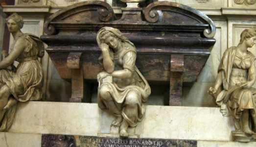 Michelangelo morì il 18 febbraio 1564, a Roma, nella sua residenza di piazza Macel de’ Corvi, dove il grande artista si era autoesiliato, non condividendo le ultime politiche dei Medici. Ma a Firenze la notizia della scomparsa ebbe molta eco e immediatamente partirono le operazioni per recuperare la salma, un’impresa guidata dal nipote Lionardo Buonarroti e raccontata, con un certo gusto epico, da Giorgio Vasari nella seconda edizione delle sue Vite. Tornati in Toscana, fu il Duca Cosimo I de’ Medici a sponsorizzare la costruzione della grande tomba monumentale in Santa Croce, offrendo gran parte dei marmi, provenienti da Carrara e da Seravezza. Prima si pensò di commissionare il progetto a Daniele da Volterra, che era stato molto vicino a Michelangelo, del quale aveva preso anche la maschera funebre, ma poi la scelta cadde su Giorgio Vasari, che pensò a una struttura architettonica nella quale pittura e scultura potessero entrare in dialogo, per celebrare le arti dell’eccelso maestro. Oltre agli affreschi e al busto dell’artista, tre sculture rappresentano le personificazioni della Pittura, della Scultura e dell’Architettura, atteggiate a lamento per la morte. Sono più di sessanta i Buonarroti sepolti nella basilica, fino al 1858, quando la famiglia si estinse.