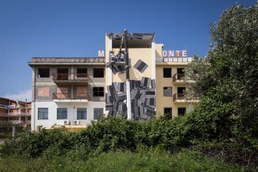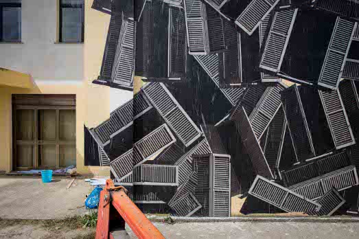 Guardato con interesse dal mondo dell’arte contemporanea, il misterioso gruppo di artisti/architetti, si è confrontato con una superficie di grandi dimensioni utilizzando la tecnica del collage sul muro. Il tema scelto dagli artisti è quello che dà il nome all’opera: Terremoto, realizzato “attraverso la moltiplicazione e l’affissione dell’iconica persiana”. Dopo le opere di Clemens Behr, Ciredz e 108, il riferimento questa volta è alla natura tellurica dei luoghi del festival e alla continua sensazione della terra che rischia di tremare sotto i piedi. In esclusiva per Exibart anche alcune preziose immagini del work in progress. (Mariangela Capozzi)