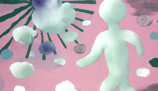 Truffa non ha fretta, attende che le sue forme si adattino tra loro, sente di doverle assecondare, farsi guidare dalla loro instabilità che cerca riposo. Così le figure iniziano a definirsi nel quadro – come quando in preda all’immaginazione interpretiamo il cielo nuvoloso – ricordano cani, uomini con cappello, case col camino che fuma, ma anche motociclette, automobili che si incrociano nel traffico iperurano, aerei che lasciano anelli di fumo, volti che sembrano nuvole, nuvole che sembrano nuvole. Tutto è smussato e bianco come sotto una spessa coltre di neve; alle ombre più chiare, che simulano un vaporoso rilievo, si alternano altre ombre scure e decisive per l’equilibrio d’insieme del quadro.