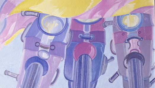 Gli anni Sessanta sono comunque molto densi: i colori pastello si associano a quelli sgargianti delle cravatte, la camicia a righe o la giacca bianca paiono animate da un corpo invisibile. Il vento, un vento silenzioso e garbato, è spesso il protagonista che fa vivere le opere di Buscioni, gonfia le camicie, sconvolge le tende, scompiglia le cravatte. Il prato verde, quasi stilizzato, è il terreno neutro che accoglie le motociclette o le scarpe da ginnastica, oggetti che paiono avere una loro interna umanità. La figura umana, l’uomo, quello in carne e ossa, non compare mai se non in labili particolari di mani che spuntano qua e là. Gli inizi degli anni Settanta sono caratterizzati da grandi tele con lingue di colore oblique ton sur ton accostate in modo ritmico e dinamico.