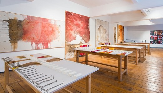 Gli strumenti sono disposti ordinatamente su stretti e lunghi banconi di legno chiaro. I profili acuminati di forbici, pinze, tenaglie, seghetti e lame di varie dimensioni, creano simmetrie luccicanti sul sottile telo bianco. Questa fredda cadenza istituita dall’acciaio, si interrompe sulla superficie trasparente di ampolle, provette e becher, che si alternano in un sottile dialogo tra fragili superfici concave e convesse. L’ordine astraente di questi elementi orizzontali, incontra un corrispettivo opposto nelle grandi tele e nei larghi camici fissati su strutture slanciate, addossate alle pareti. I grumi caotici e le densità varie che ne chiazzano i tessuti, evocano la gestualità di una funzione reale, organica.
