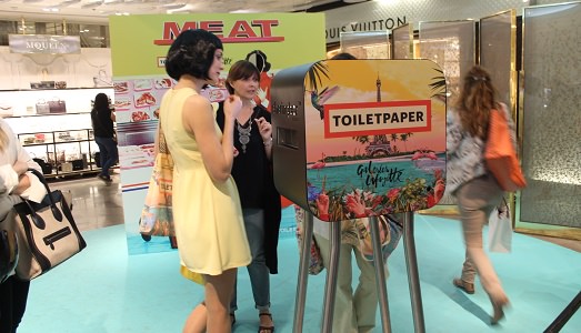 Toiletpaper ovvero Maurizio Cattelan e Pierpaolo Ferrari approdano a Parigi con le ormai celebri e coloratissime fotografie, mobili vintage e gadget a iosa, e con l’inventività che è propria a questo duo di estrosi italiani, che si cimentano con le prestigiose Galeries Lafayette.