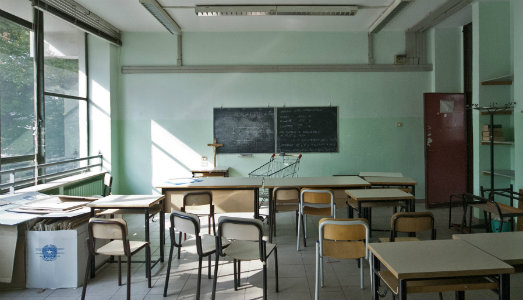 «Con i ragazzi siamo entrati subito in sintonia e i risultati sono stati incredibili», hanno commentato Paolo Assenza e Germano Serafini, che insieme ad Arianna Bonamore formano il collettivo SpazioY e che per Ricreazione hanno insegnato e imparato a vedere, invitando gli studenti a soffermarsi sull’atto dell’osservare e, quindi, a restituire il loro punto di vista, attraverso la forma di un compito in classe in cui non ci sono state limitazioni di traccia o di voto. Antonio Della Guardia ha composto una frase di Gianni Rodari, tratta da Grammatica della Fantasia, il font scolastico delle lettere bianche è incorniciato dalle finestre di una classe, la sintassi diventa effimera e si alleggerisce verso l’esterno. Veronica Bisesti ha usato la plastilina colorata per intervenire sulle imperfezioni dei muri, sulle aperture, sui buchi e sui graffi, coinvolgendo i bambini di classi elementari e medie, che hanno riscoperto quella superficie così familiare. Sulla cucitura e sul riconoscimento si è invece concentrato Giovanni Gaggia, che ha invitato i ragazzi a cucire, con dei ritagli di tessuto di diverse forme e colori, una bandiera.
