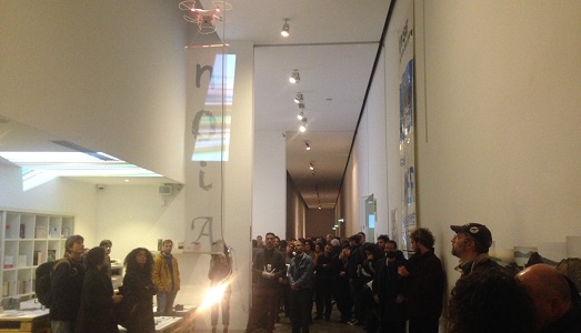 L’ordito che costituisce queste maglie, è la trasposizione di un percorso iniziatico che diventa materiale per un ciclo di performance che ha scandito la prima serata inaugurale, in contemporanea all’ouverture delle mostre di Josh Kline e Harun Farocki. L’azione di g. olmo stuppia, è la prima drone performance avvenuta alla Fondazione Sandretto, una scultura in movimento che il più delle volte ha fatto girare il capo all’insù al pubblico in sala, con un banner fluttuante in chiffon parigino recante la scritta “n.O.I.A” (Nonostante Oltralpe Insistano Ancora): atto di denuncia reiterato contro i paesi più forti della Ue; e poi i paradigmi di Francesco Nordio, ovvero mappe concettuali sul neoliberismo finanziario e le relative condotte da attuare per mettere in crisi il sistema capitalistico. La performance degli Apparatus 22 sull’equità e sul valore economico dell’arte. Il lavoro di Anna Lascari, artista che ha rappresentato la Grecia alla prima Biennale del Sud a Caracas, in mostra con un’opera sull’abbattimento dei confini al neon e plexiglas, Barrier; Fiona Marron, artista scelta dal collettivo irlandese in mostra con due installazioni e un’opera video; Kostas Rousakis, che attraverso visori per diapositive ci conduce in un cimitero di altoparlanti in cui riecheggiano le domande e rifiuti del sistema. L’opera Check the condition. A real-time archive on the emergent curatorial open calls in Spain, di Alejandro Castañeda, Carles Àngel, Sofía Fernández, Álvaro Giménez, Jone Uriarte: un archivio sull’emergenza curatoriale in Spagna che palesa la grande precarietà e povertà di spazi indipendenti. Silent Peace, di Pavlos Nikolakopoulos, con dentelli acuminati come spettro di un sistema finanziario avanzato. E Giulio Delvè con Muralismi, un pezzo dei graffiti della Berlino est che viaggia di esposizione in esposizione, come diaspora di una vecchia Europa oramai ridotta a una signora anemica. (Rino Terracciano)