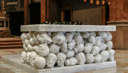 La difficoltà era inserire elementi di arte contemporanea, che potessero raccontare qualcosa del nostro oggi, del periodo in cui viviamo, in un contesto di arte sacra. Parmiggiani ha realizzato l’altare in onice bianco che, a contatto con la luce, evidenzia la sua trasparenza, costruendo un’opera ricca, con volti di personaggi illustri e meno conosciuti che si sono susseguiti lungo la storia. In essi, egli vede tutta l’umanità, ogni viso racconta una storia, con le due lastre bianche che esprimono la purezza e il desiderio di fraternità universale. L’altra opera è l’ambone in pietra labradorite, dalle forme semplici e pulite, che cattura l’attenzione per i riflessi che si scatenano sulla superficie, espressione anche di una materia che contiene luce interiore. Una pietra venuta dal cielo, che incarna la parola di Dio, l’idea di ritrovare tutta l’umanità che non aspetta altro di essere riscattata. Molte le difficoltà di realizzazione dal punto di vista costruttivo, dovendo trovare delle mediazioni tra il disegno e la statica, la gravità e l’aspetto logistico per il trasporto dei materiali delicati delle opere.