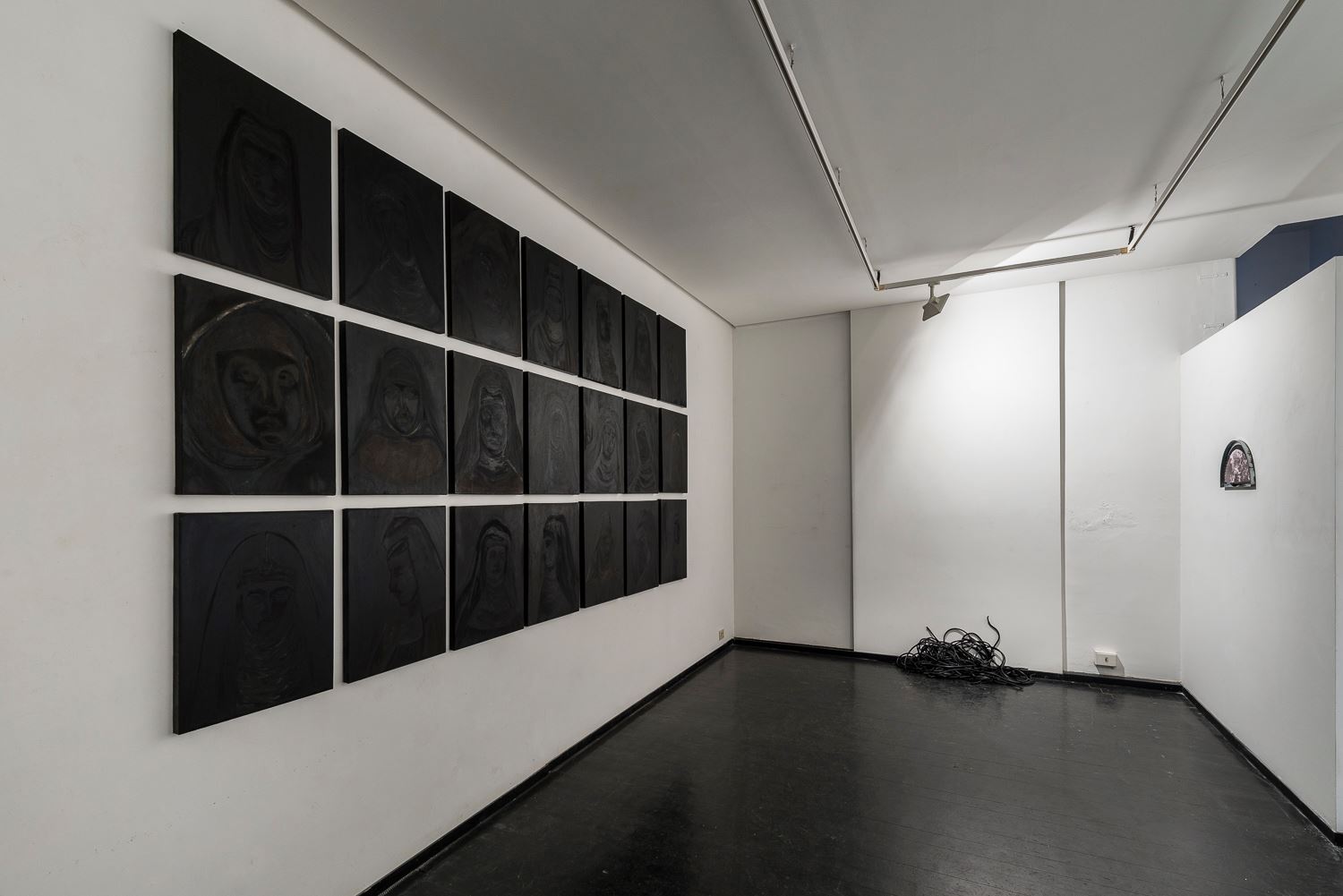 Ventuno suore e un groviglio di viscere di liquirizia sono i poli d’attrazione delle storie nere di Rita Mandolini nella mostra “Disturbo di comprensione” che chiude oggi a Roma, ospitata dall’associazione Operatori Culturali Flaminia 58 e curata da Diletta Borromeo. Una personale intimamente femminile, una sorta di autoritratto scomposto, uno scandaglio interiore che sfida il visibile, il limite degli occhi. Il titolo, spiega la curatrice, allude al «meccanismo psichico e psicosomatico causato da fattori mentali quali lo stress e il conflitto” che “dà luogo a fenomeni che esprimono chiaramente ciò che fino a quel momento è stato celato, invisibile ad occhi esterni».