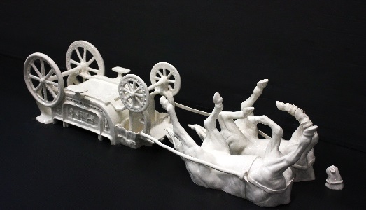 In questa sua personale che è quasi, nonostante sia ancora molto giovane, un’antologica, presenta diverse proposte: i vegetali, la ceramica, la porcellana e la carta, più altre “raffinatezze” che sono una sorpresa. Lo Spazio Testoni è composto da una sala d’ingresso più grande e da tre salette più piccole e subito s’incontrano i muri di vegetali sulla sinistra e le due opere inedite al centro, entrambe in ceramica bianca cristallizzata. Concerto per orchestra solista, del 2019, rappresenta l’individualismo presente nella quotidianità. Un mondo dove ognuno ha un suo strumento e un suo Direttore, con i quali “suona la sua musica”. L’altra opera inedita è Undertruth, del 2019, che consiste in una carrozza barocca rovesciata, con le ruote per aria e i cavalli che muovono le zampe nel vuoto. Nelle salette, altre particolarità, come la Collana ispirata a Leonardo in onore della ricorrenza del cinquecentenario della scomparsa che si commemora nel 2019. Poi, nell’accesso al cortile, il Trittico de L’orMa e altre opere vegetali, come quella che vinse il Premio Euromobil.