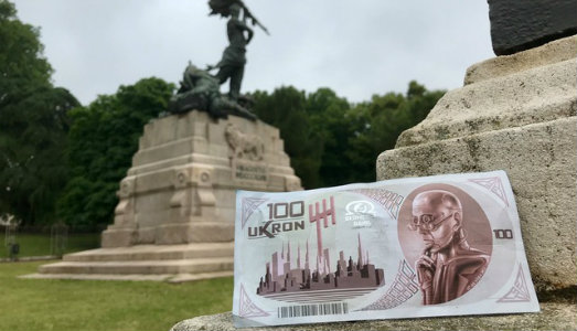 Il racconto sotteso all’azione artistica. immagina che gli apolidi digitali Dusty Eye siano venuti fortunosamente in possesso di un ambizioso bottino di molti milioni di Ukron, banconote in carta filigranata corrispondenti ciascuna a 1123,58 dei nostri euro. Una cifra da condividere e fare circolare, per scardinare il dominio dei pochi sui molti che si acuisce sempre più in una prospettiva futura di ecoterrorismo, limitazioni di libertà di espressione, esecuzioni capitali e deportazioni dei dissidenti sulla Luna o su Marte.