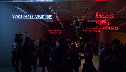 Così, alcune frasi tratte dai brani di Primo Levi e Liliana Segre costituiscono la guida nel percorso immersivo e catartico cui il visitatore è chiamato: “considerate se questo è un uomo che muore per un sì o per un no”, il nero delle lettere in ceramica lascia permeare tutto il senso di angoscia che questa frase implica, raggiungendo il culmine nel contrasto con il neon rosso delle parole “sì” e “no”; “NOBODY CRIED, NOBODY TALKED”, “ONE DAY GOD WAS ABSENT”, frasi che oltre all’esattezza delle parole – da intendersi in senso calviniano, come ha evidenziato Chiara Gatti all’interno del suo saggio in catalogo – possiedono un’esattezza di comunicazione in quanto il rosso, così luminoso e sanguigno, penetra oltre lo sguardo e rimane impresso nella mente di chi guarda, anche una volta chiusi gli occhi.